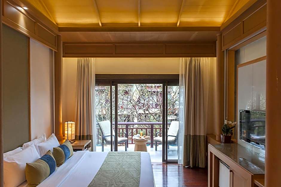 DELUXE REGENCY POOL VIEW is 409 square feet and includes a king-size bed 150-183 width plus balcony, extra beds on demand, cable tv, hairdryer, tea and coffee making facilities , safe, bathrobes, and slippers.
